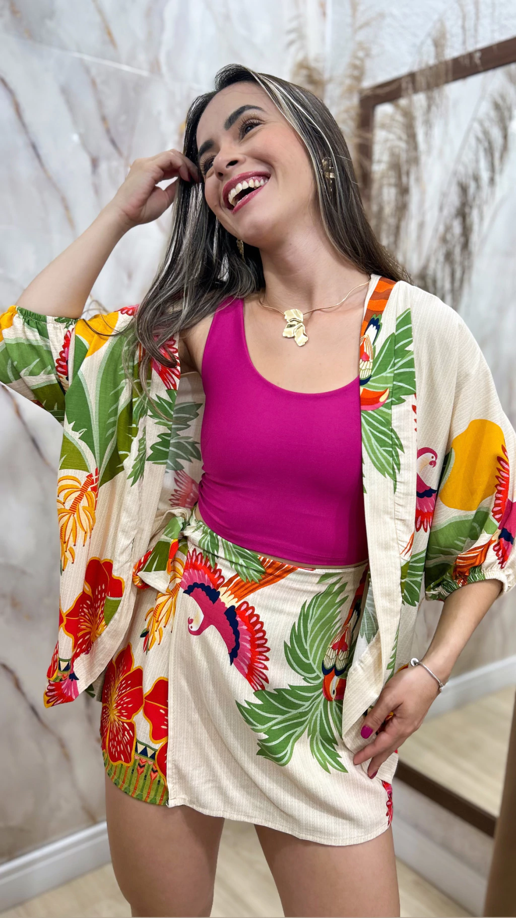 Conjunto composto por kimono e short saia. Confeccionado no tecido viscolinho, esse modelinho oferece todo frescor e delicadeza que um look de verão precisa.
