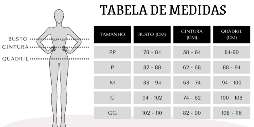 *Todas as peças que possuem a tabela de medida abaixo, possuem os respectivos tamanhos.