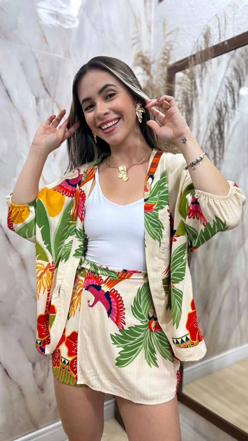 Trijunto composto por kimono e short saia + a blusa Croped que está compondo o look.