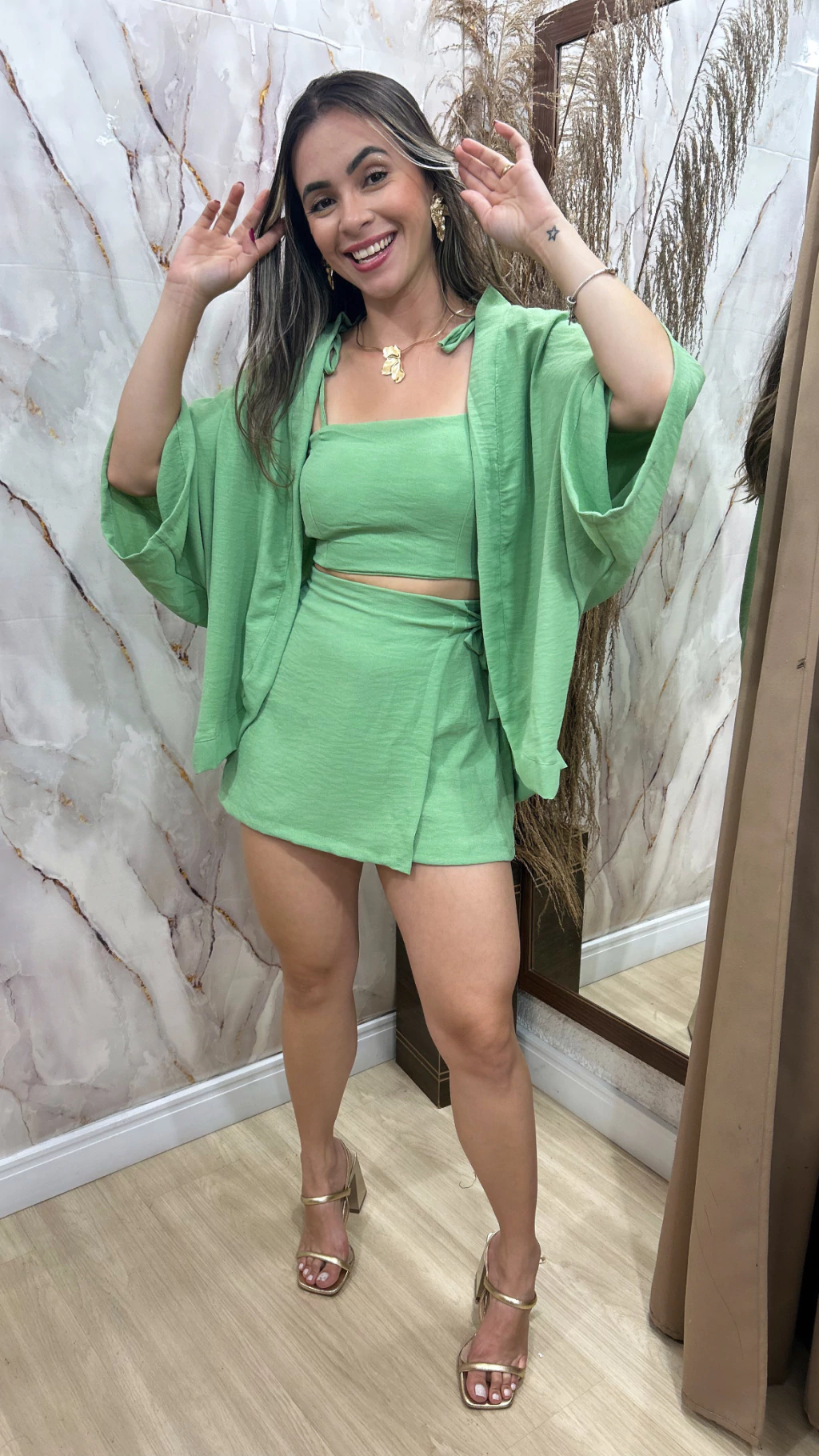Trijunto composto por kimono e short saia + a blusa Croped com amarração nas aliás.