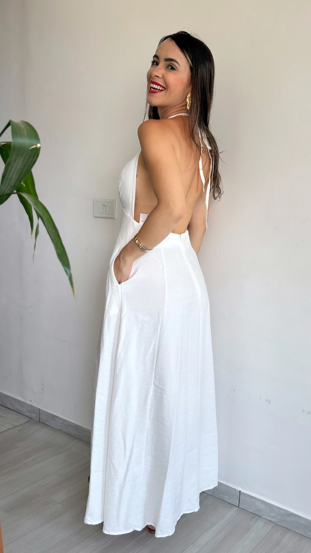 O Vestido Miriam une conforto, elegância e estilo com um leve toque sensual, mostrando as costas e tendo um decote em "V".